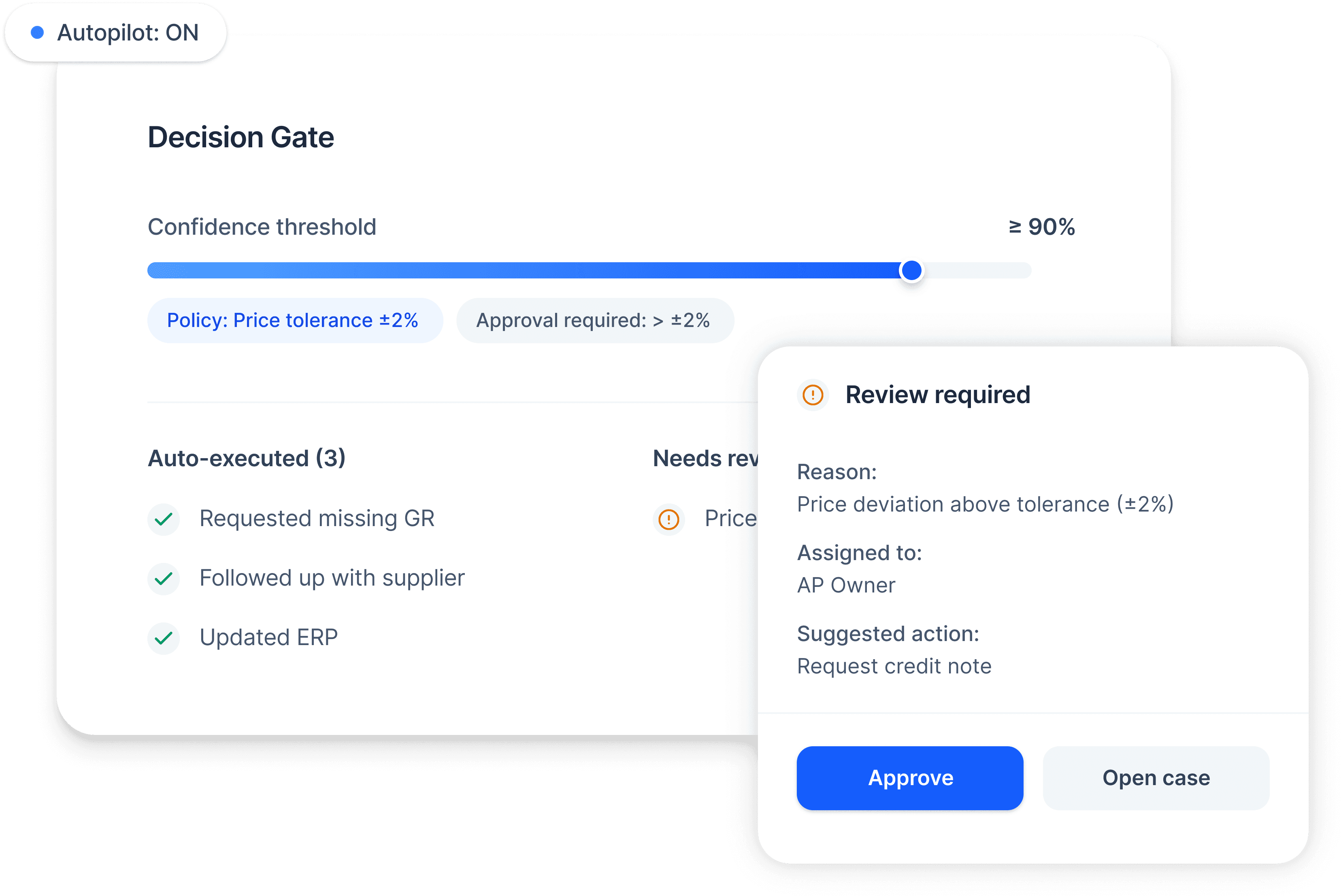 Resolves exceptions automatically when confidence and policy allow. Otherwise it routes the case with full context and an audit trail.