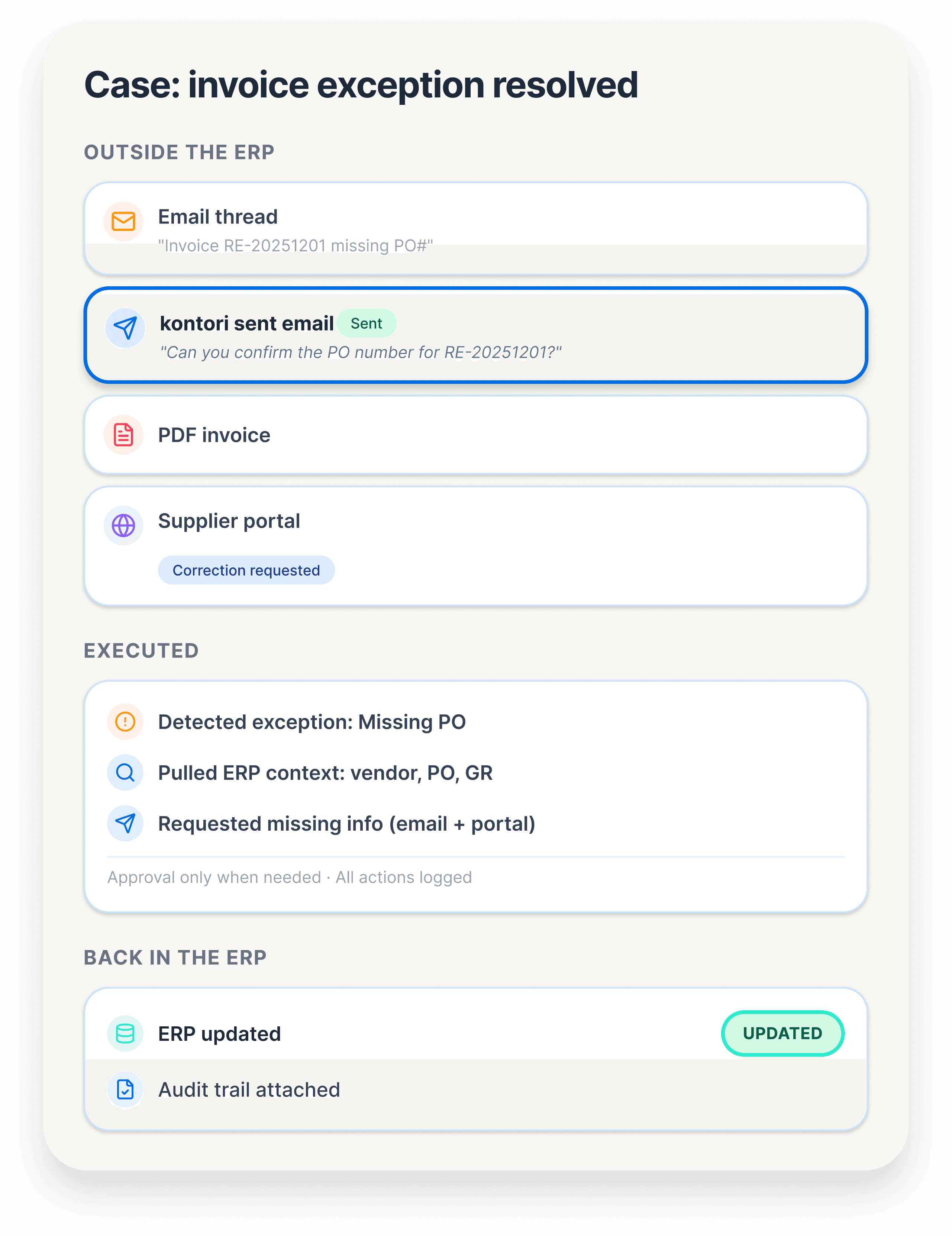 kontori automates the manual work needed to resolve ERP exceptions across email, PDFs, Excel, portals, and Teams.